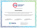 За время работы подтвердил свою квалификацию получением топовых сертификационных статусов компании (ISC)2, ISACA, CompTIA, VMware, EMC (Dell Technologies), Microsoft, Hewlett-Packard и Check Point.